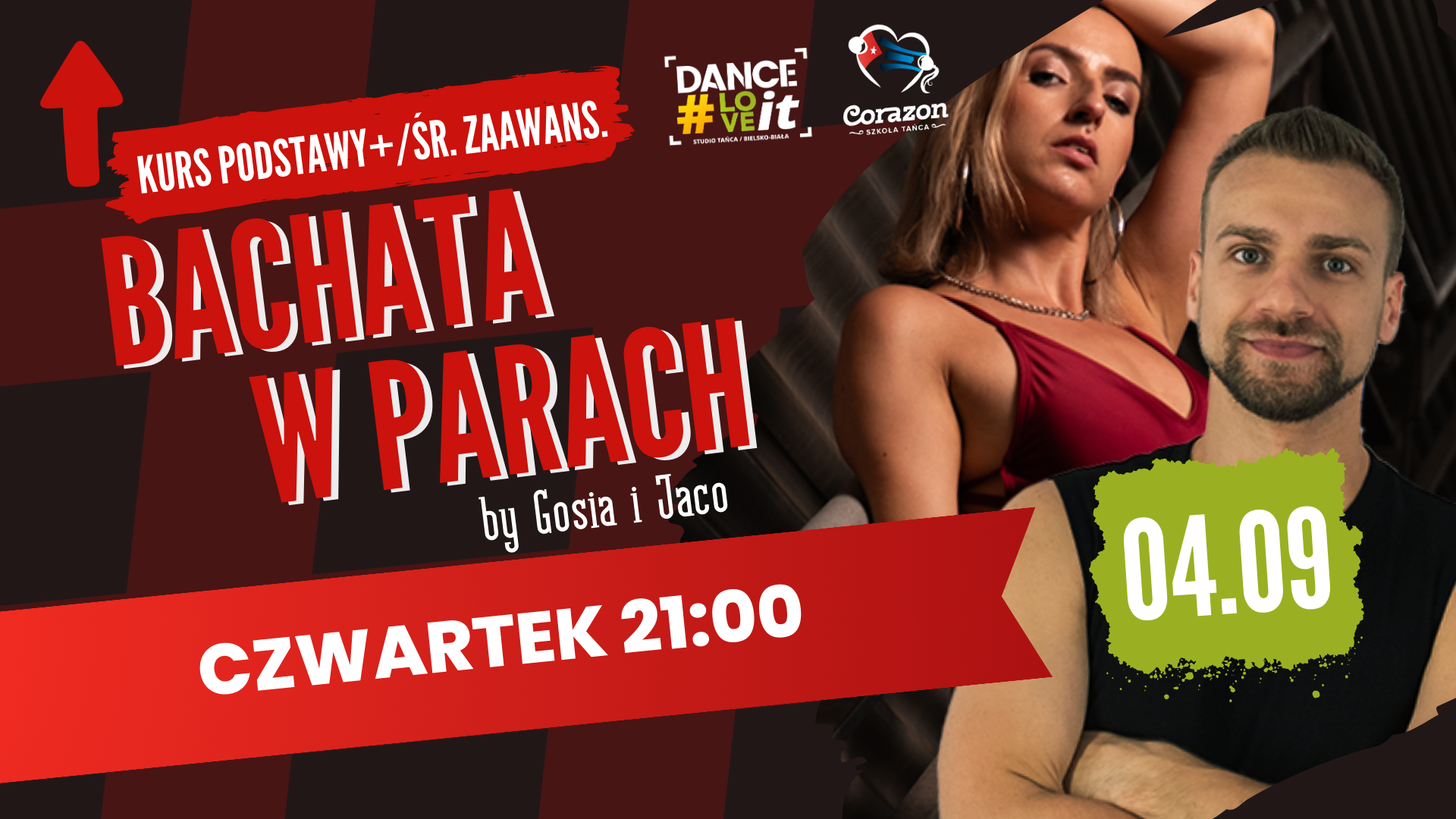 - BACHATA W PARACH – POZIOM PODSTAWY plus / OPEN // czwartek 21:00 // start od 04.09.2025 – instruktorzy Gosia Tracz i Jacek Ratuszyński