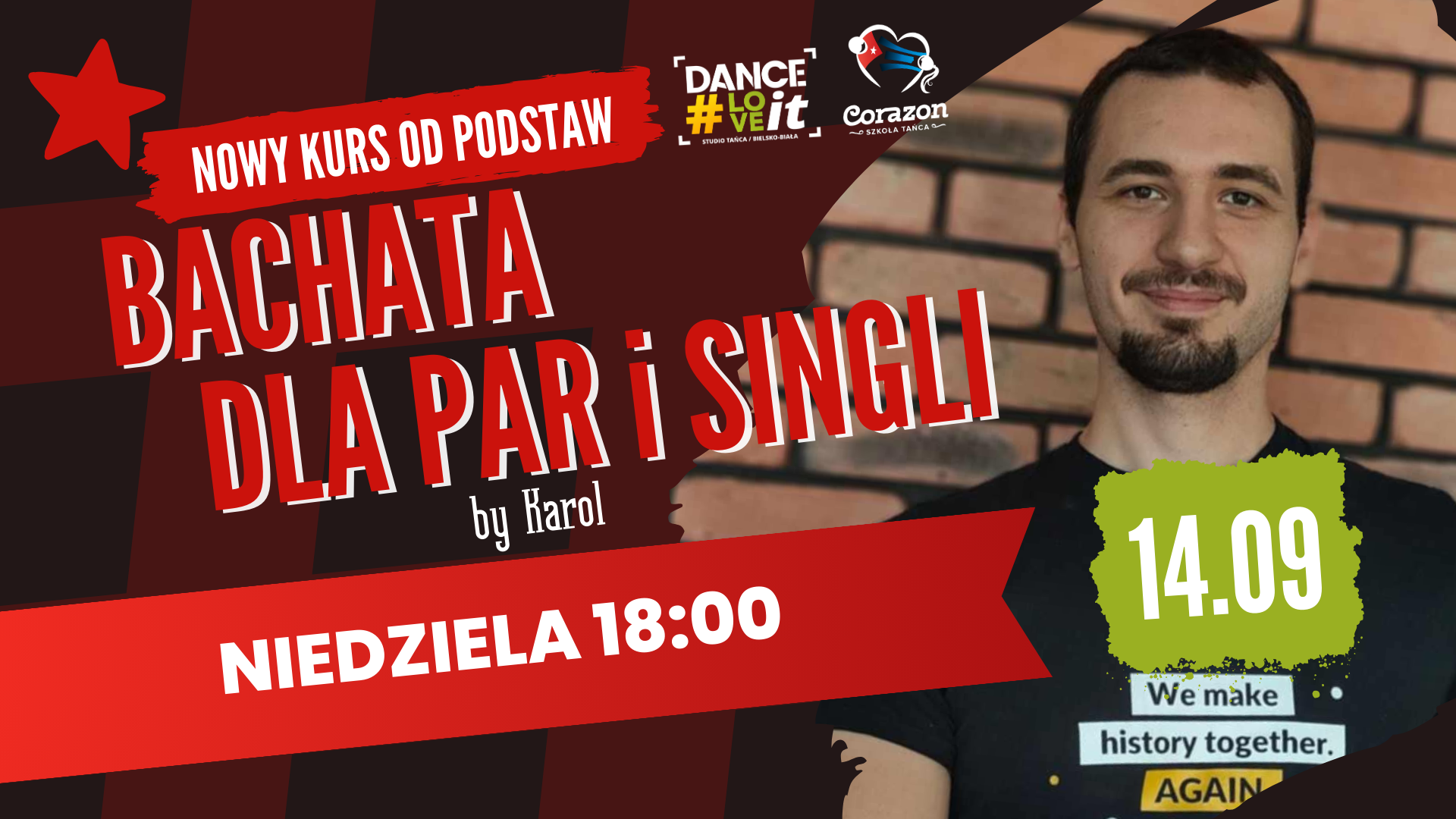 ———————————————————————- - BACHATA W PARACH – OD PODSTAW „od 0” nowy kurs dla par i singli w każdym wieku // KURS W PARACH, ale NIE MUSISZ MIEĆ SWOJEJ PARY, bo na sali podczas kursu zmieniamy się w parach // niedziela 18:00 // start od 14.09.2025 – instruktor Karol Staszko